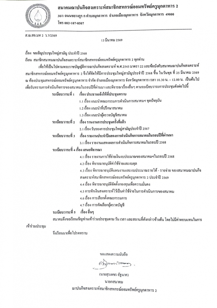 ขอเชิญประชุมใหญ่สามัญ ประจำปี 2568 สมาชิกสมาคมฌาปนกิจสงเคราะห์สมาชิกสหกรณ์ออมทรัพย์ครูมุกดาหาร 2 ทุกท่าน