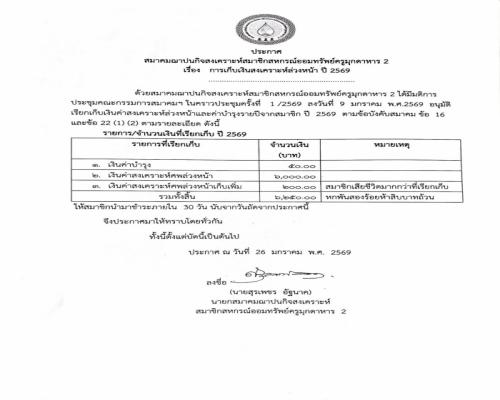 ประกาศ สมาคมฌาปนกิจสงเคราะห์เพื่อครูมุกดาหาร เรื่อง การเก็บเงินสงเคราะห์ล่วงหน้า ปี 2569