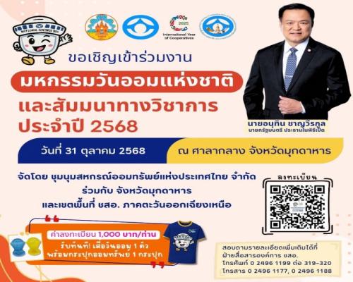 ขอเชิญเข้าร่วมงาน มหกรรมวันออมแห่งชาติและสัมมนาทางวิชาการ ประจำปี 2568 วันที่ 31 ตุลาคม 2568 ณ ศาลากลาง จังหวัดมุกดาหาร